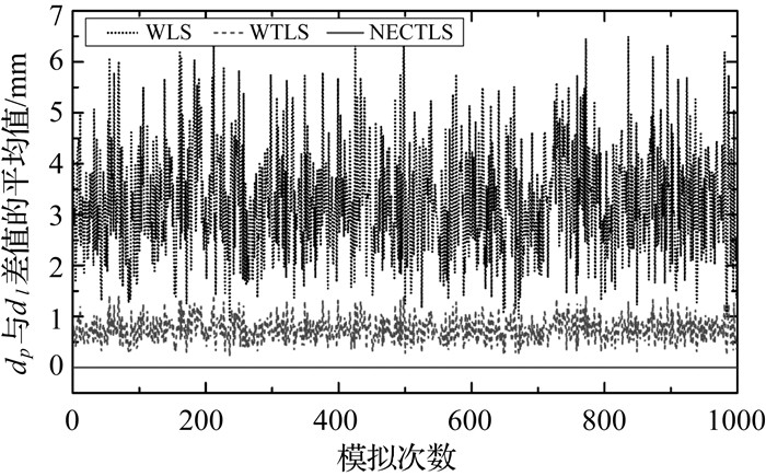 每次模拟计算完成后,计算各测量点到拟合点的距离dp和测量点到拟合直线的距离dl,并计算它们差值的平均值:∑(dp-dl)/8。如图 4所示,NECTLS的差值等于零,表明这两种距离相等;WLS和WTLS的差值大于零,表明这两种距离存在明显差异,且dp大于dl,同时WLS的差异最大。