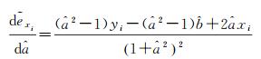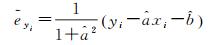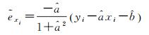 式中,a是斜率;b是截距;(xi, yi)是一组观测数据,即测量点。观测值yi组成观测向量y,观测值xi组成系数矩阵A=[x 1];协因数矩阵Qx=[diag(wx1, wx2, …, wxn)-1,Qy=[diag(wy1, yx2, …, wyn)]-1。