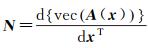 式中,A(x)表示A是关于x的矩阵函数;⊗表示克罗内克积;N表示nm×n的转换矩阵[7],根据向量求导法则可推得其计算式[5],即