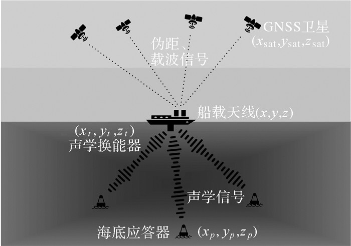| 图 1 GNSS/声学联合定位原理 Fig. 1 The principle of the GNSS/acoustic joint positioning |