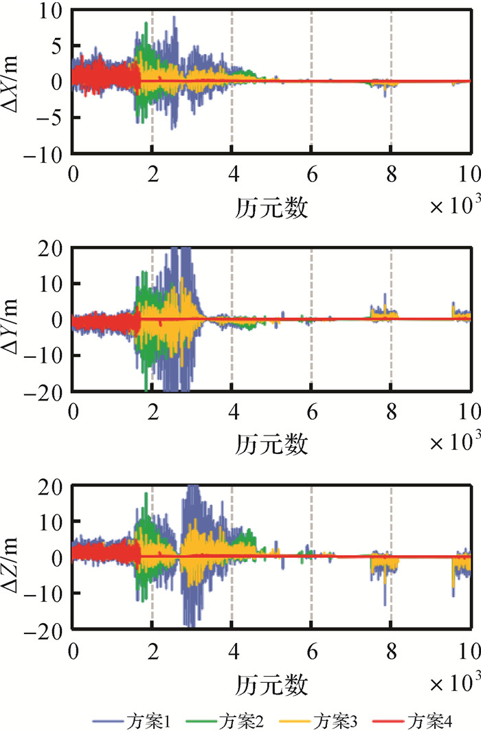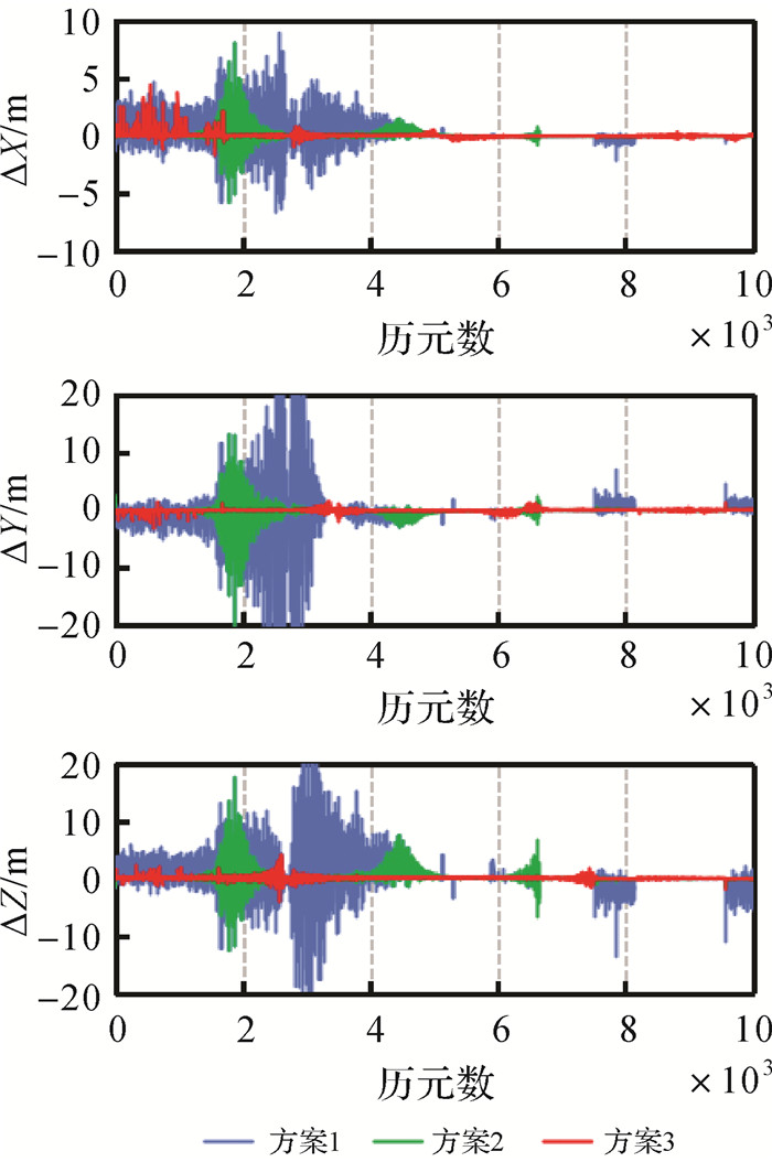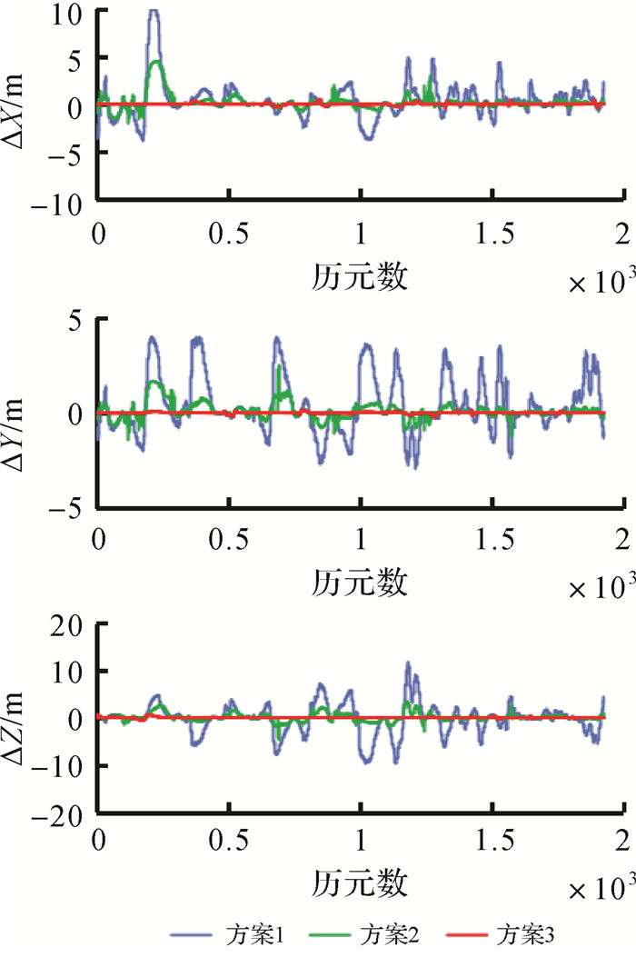X、Y、Z方向上各方案的对比结果如图 8所示,另分别统计偏差序列的RMS值见表 3。