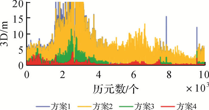 由于在多个随机观测历元内,试验另加入了载体加速度扰动,导致动力学信息异常影响被放大。由图 7可知,标准卡尔曼滤波算法没有调控能力,整个滤波过程始终存在5~10 m的波动,结果中没有体现出明显的滤波收敛现象。而引入两种自适应滤波算法的方案2和方案3都具备较好的调节适应能力,波动明显减少,定位结果更稳定,这与仿真试验结果一致。一方面,说明在GNSS/声学联合定位模型中引入自适应滤波算法可以有助于抑制状态扰动对结果的影响;另一方面,单因子自适应滤波算法虽然利用单一的自适应因子实现了对整个预报向量权阵的调节,但这样做的后果是,削弱了未发生异常的参数对模型估计结果的贡献,滤波效果提升有限。从图中易发现,方案3较方案2结果更稳定,滤波没有较大的跳跃,精度有明显提升,这是因为自适应选权滤波算法根据不同类型的状态参数,分别构造对应的自适应因子,以自适应因子阵的形式调节预报权阵,更符合自适应的要求,从而有效控制扰动状态对滤波结果的影响。