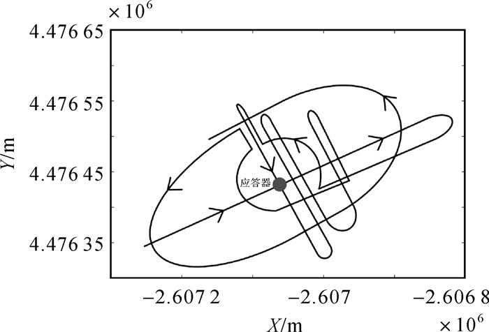 | 图 6 测量船航迹及应答器平面位置 Fig. 6 The track of the surveying vessel and the schematic diagram of the transponder plane position |