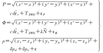 式中,上标s表示卫星;P、Φ表示进行了消电离层线性组合后的伪距和载波相位观测量;ρ表示船底换能器至海底应答器的距离,由声学信号测量得到;c表示真空中的光速;