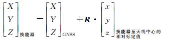 水下部分采用的基准坐标是船底换能器坐标,而海面定位只能得到船载GNSS天线中心地理坐标,两个基准点存在位置偏移。在统一观测信息进行整体求解时,可以将3种主要的姿态角视为待估参数一并进行估计[21]。实际处理时,一般需要预先对船载传感器测量中心点间的相对位置进行标定,利用标定值、姿态角测量值和船载天线中心地理坐标,可以得到全球坐标框架下船底换能器的绝对坐标,如式(2)所示,其中R包含姿态转换矩阵以及局部坐标系与全球坐标系间的旋转矩阵