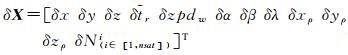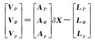 式中,V=[VP VΦ Vρ]T和L=[LP LΦ Lρ]T分别为误差方程的残差项和自由项;系数阵A=[AP AΦ Aρ]T中包含了3种姿态角参数的对应项;待估参数δX的具体形式为