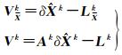 式中,LXk即预报值向量Xk,其协方差矩阵为ΣXk,对应权阵为PXk;VXk表示其在k时刻的残差向量;观测值向量的协方差矩阵为Σk,对应权阵为Pk;Vk表示其在k时刻的残差向量。进行卡尔曼滤波估计时,同时使用动力学模型信息和观测信息求解状态最优估值,根据最小二乘原理可以写出如式(6)所示目标函数