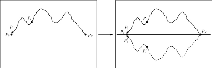 由于闭合地理要素的横纵坐标函数具有周期性,因此可以直接计算其形状特征向量。对于非闭合的地理要素,则需要对其进行镜像对称操作,使其获得周期性,如图 1所示。