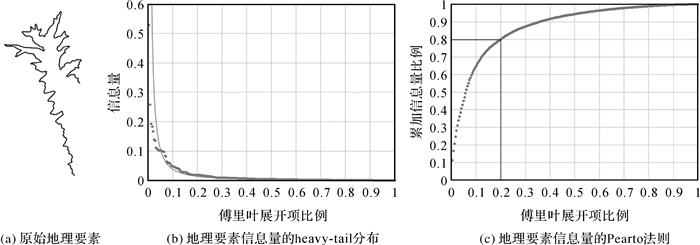2.2 曲线信息量的Head-Tail分布傅里叶描述子所得到的曲线信息量反映了地理要素整体的复杂程度,但是却不能描述曲线各个频率信息量的比例关系。总体而言,地理要素的傅里叶低频部分反映要素的整体形状,高频部分反映要素的细节特征。从图 2(b)中不难发现地理要素的频域信息量在统计学上符合重尾分布(heavy-tail distribution)的模型;图 2(c)展示了地理要素的逐次累加信息量与傅里叶展开项数之间的关系,即较小部分的头部频率包含了大部分的要素信息量,而较大部分的尾部频率所含的信息量相对较少,符合Pareto法则的特点[29]。