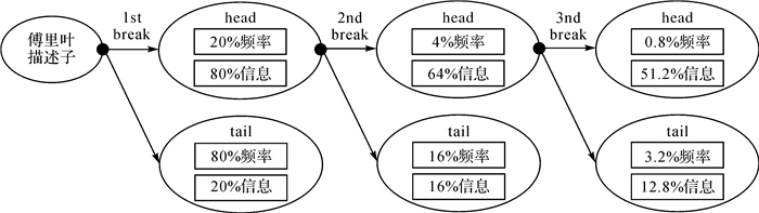 对于图 2中的地理要素,其Pareto法则可以表述为:20%的重要频率占据了80%的形状信息,80%的非重要频率占据了其余20%的形状信息。由此,Pareto法则将该要素的频率分成了两部分:头部的重要频率集以及尾部的非重要频率集。根据该法则就可以以地理要素各个频率所含的信息量为统计量,将不同的频率信号分割成两个部分,即占有绝大部分信息的Head部分和包含小部分信息量的Tail部分。根据Head-Tail数据分布模式,某些符合Heavy-Tail分布的数据集,其头部可以按照一定的比例继续分裂[21-22]。在实际应用中,Head部分仍可按Head-Tail模式继续分割,形成递归模式。如图 2(c),该地理要素的头部部分在一定程度上仍满足Pareto法则,只是在分割比率上会存在一定的差异。对于第i次分裂的地理要素信息向量,若其比例为pi的重要频率集占据了1-pi的形状信息,1-pi的非重要频率集占据了其余比例为pi的形状信息,则可记录其第n次头尾分裂的中断比例为pi,进而可以得到描述该数据集分布状况的分裂比例特征向量Vp=[p0 p1 p2…pi]。以满足“二八定律”的数据集为例,其Head-Tail分布如图 3所示。