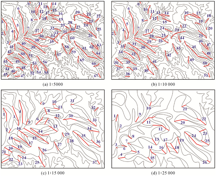由图 6可以看出,随着地图比例尺的逐渐减小,等高线数据间的山脊线与山谷线数量也会随之减少。例如,在较大尺度的地图中,图 6(a)中的线段8、40、67以及图 6(b)中的线段8、38、44在尺度变小的过程中逐渐消失;而当比例尺减小到1:25 000时,简化后的地图仅保留了一些较为关键的山脊线与山谷线形态特征,例如图 6(d)中的线段12、20、24,在4个尺度的地图中均被保留。此外,根据表 3中山脊线与山谷线数量的预测值与实际值对比结果,可以发现地图各个层次比例尺上的山脊线与山谷线数量大致上与传统方根模型的预测结果相符合,且误差率相对较低。这也验证了使用本文方法所得到的地图多尺度表达效果是符合地图综合规律的。