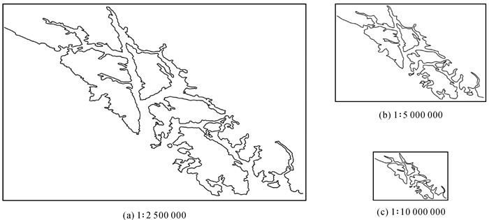 | 图 7 实际尺寸对比下的海岸线多尺度表达 Fig. 7 Multi-scale representation of coastlines under correct size contrast |