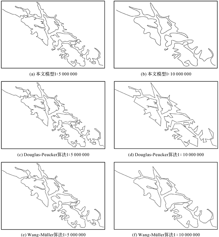 由图 7可以看出,本文模型对于较复杂的海岸线数据,根据设定的目标比例尺所得出的结果同样在视觉上具有较强的层次性。因此,综合图 4—图 7可以得出结论:无论对于小比例尺地图还是大比例尺地图,使用本文模型对地理要素进行多尺度表达均取得较好的效果。为验证本文模型的可行性与优越性,将本文模型与传统的Douglas-Peucker简化算法及Wang-Müller简化算法进行比较,在1:5 000 000与1:10 000 000两个比例尺上,控制原要素与3个简化模型化简后的面积重叠比一致,并得到相对应的要素简化形状。试验对比结果如图 8所示。