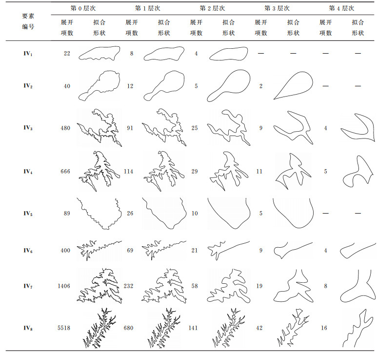 3 试验与分析 3.1 单独地理要素的分割层次分别选取4条不同复杂程度的闭合地理要素及非闭合地理要素,编号为IV1-IV8。使用Head-Tail分布模式并设置40%的头部阈值对其进行“量子化”层次分割。分割后的各层次结果如表 2所示。