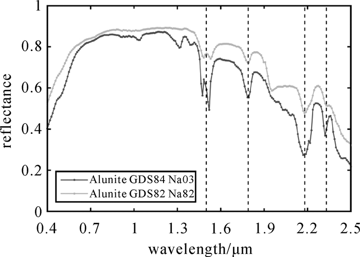 | 图 1 Alunite GDS84 Na03和Alunite GDS82 Na82光谱反射率图及吸收波峰 Fig. 1 Reflectance of Alunite GDS84 Na03 and Alunite GDS82 Na82 as well as their absorption peaks |