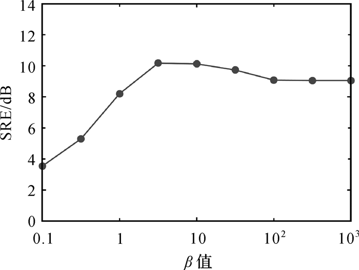 首先,讨论参数设置对算法性能的影响。本文算法主要包括3个参数:λ、α和β。对于λ,由于λ控制联合稀疏约束的强弱,本文参考CLSUnSAL对λ进行设置。α控制光谱库校正项的强弱,类似于μ、α对算法的收敛速度和稳定性有影响,本文将α设置为固定值1000。图 3展示了不同β值对算法性能的影响。可以看出,算法在β∈[3, 100]区间取得了较好的解混结果,过小的β值会使R的变化不受约束从而造成算法性能的大幅下降,而过大的β值可能造成无法对光谱库进行有效调整。