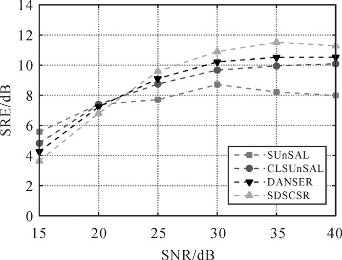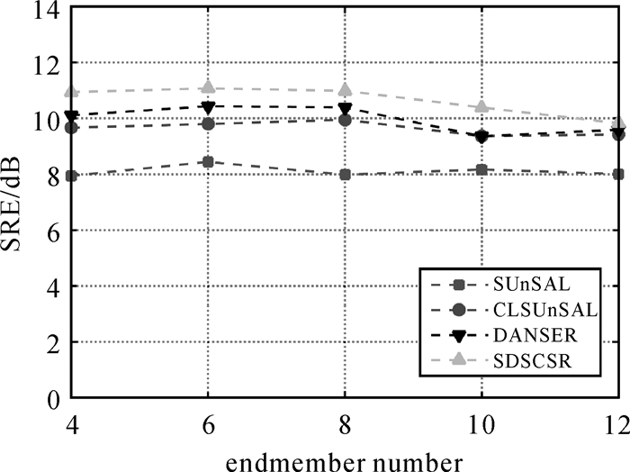 图 4展示了算法在不同端元个数下的SRE结果。在这个试验中,M的取值为4~12均匀取值,并保持J/M的值为0.5。可以看出,在所有的M取值中,SDSCSR均取得了最好的解混结果,只有当M为12时,SDSCSR的优势较小。本试验验证了SDSCSR对端元个数的抗差性。