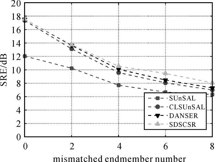图 5展示了算法在不同不匹配端元个数下的解混性能。在这个试验中,保持端元总数为8个,通过变化J的取值控制光谱库不匹配的程度。可以看出,在存在不匹配端元的情形下,SDSCSR的解混结果均优于其他对比算法。在不匹配端元个数为0的情形下,SDSCSR取得了与CLSUnSAL相当的解混结果。特别地,随着J取值的增大,SDSCSR相对于CLSUnSAL的优势更加显著。