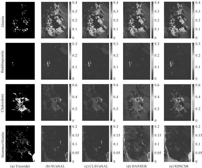 试验中,对比算法依然采用原文献中推荐的参数设置,为SUnSAL和CLSUnSAL分别设置稀疏约束参数λ为0.001和0.01,为DANSER设置参数(p, λ, μ)=(0.5, 3, 1000),为SDSCSR设置参数(λ, α, β)=(0.01, 1000, 10)。图 8展示了不同算法解混得到的4种矿物对应的丰度图像以及由Tricorder 3.3软件[26]得到的矿物分类图。这4种矿物被认为在Cuprite数据中占主要成分。从图 8可以看出,SDSCSR得到的丰度估计结果与分类图具有较高的一致性。然而,SDSCSR估计的丰度图像与对比算法存在一些不同。对于Buddingtonite和Chalcedony,SDSCSR估计的丰度显著区域在视觉上更加接近于分类图,而对于Montmorillonite,SDSCSR估计的丰度显著区域与DANSER保持一致。因此,本文算法能够使光谱库较好地适应实际场景,在存在光谱差异的情况下具有较好的解混性能。