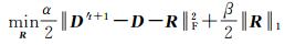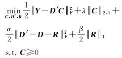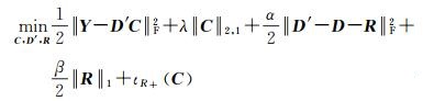 式中,α、β > 0为约束项系数;D′为校正后光谱库;R为光谱库校正矩阵。相比于原始联合稀疏解混模型,新模型主要添加了光谱库校正项以减轻由光谱库不匹配造成的不良影响。其主要思想是,允许光谱库中光谱信号在一定范围内进行局部调整,并充分利用光谱差异的稀疏特性,使得调整后光谱库更加适应当前场景。