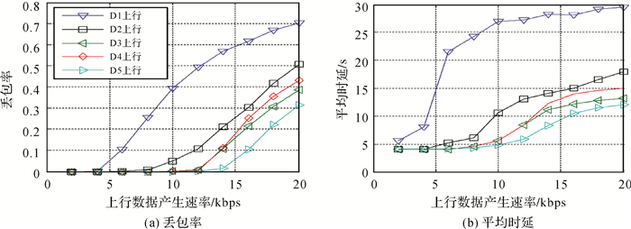 3.3.1 北斗系统星间链路体制的设计试验验证星间链路技术体制试验采用纯硬件及纯软件试验模式,构建了局部硬件规模和软件全规模的仿真场景,验证了星间链路星星地一体化流程的正确性,信息层接口设计的正确性和匹配性。首次验证了整网条件下星间信息传输的有效性,不同信息速率下业务传输网络传输时延、丢包率、网络容量及吞吐率的能力。选取了几种典型的星间链路网络设计方案进行评估,D1—D5分别为传统、优化和自适应的星地建链参数优化方法,比较了北斗系统中不同上行数据产生速率下各星间链路网络设计方案的性能。验证结果如图 11所示。