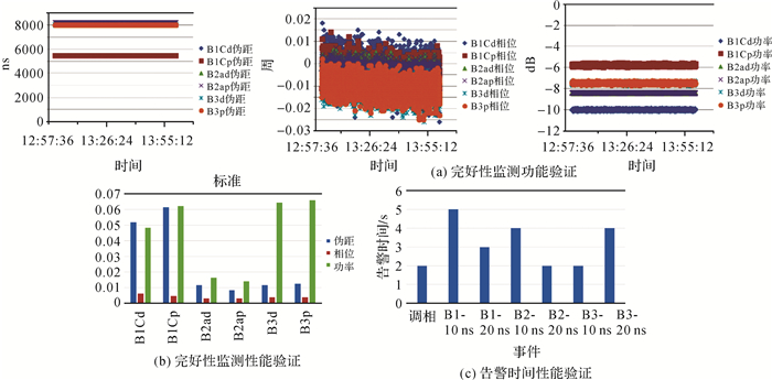 3.3.2 北斗系统卫星自主完好性功能的工程对接试验验证地面试验验证系统采用虚实结合的工作模式,构建了系统硬件环境和真实卫星互联互通的仿真场景,开展了与北斗系统卫星的对接试验工作。重点针对卫星自主完好性处理功能及流程的正确性等进行了试验。验证了卫星伪距、载波相位、信号功率、调相调频等完好性监测数据的连续性,并对告警时间等指标进行了验证,实现了基本完好性告警全流程的试验。卫星自主完好性体制试验验证结果如图 12所示。