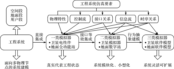 一类模拟器,直接采用工程真实系统,确保技术状态与真实系统完全一致,主要包括工程卫星电性件设备、地面段运行系统等;二类模拟器,将卫星、地面段等系统进行模块化、小型化优化设计,在对外接口特性以及内部信息流、时序关系与工程保持一致的前提下,实现功能高度集成和等效,包括卫星模拟器、数字地面站等;三类模拟器,对真实硬件系统的行为进行抽象和软件建模,并确保对外表现和内部信息流、时序关系与工程基线基本等效,包括卫星软件模型及地面段各分系统软件模型等。