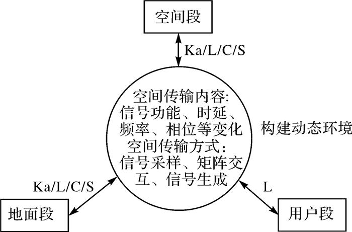 2.3.2 构建动态环境仿真与传输平台,实现系统时空特性的动态模拟空间环境的模拟仿真是卫星导航系统建模的重要组成部分,也是能够真实构建系统运行状态的重要环节(图 4)。试验验证系统在实现工程系统仿真建模的基础上,进一步采用多频段射频信号采样与生成、万兆光信号多入多出交互及高精度动态信道特性实时模拟等技术,构建系统间的动态运行环境,实现不同信道条件下多链路、多频段大范围与高精度并重的功率、时延、相位、频率变化模拟;实现多系统间信号层真实环境的仿真模拟,使系统具备下行导航、上行注入、星间链路与锚固链路全频点,多星多站全规模链路全涵盖,使得卫星、运控和用户设备在地面静止条件下可以等效为参与了系统的真实动态运行状态,完成系统内静态信号到空间动态信号的转换;实现工程模型与软件仿真平台的星间、星地等信息交互与运行流程的真实模拟。