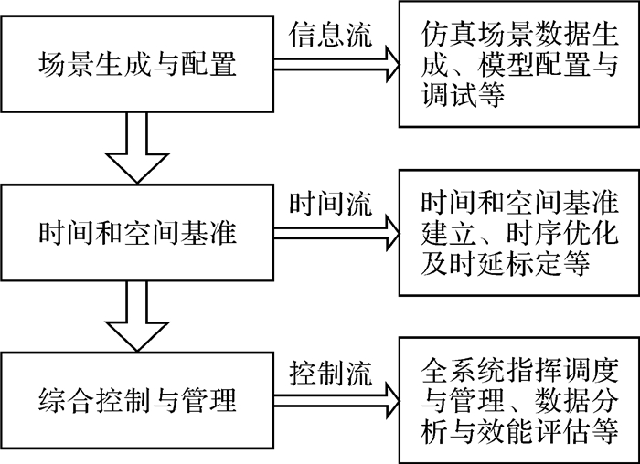 在完成系统模型建立和环境模拟的基础上,还需构建全系统的仿真架构,实现全系统全规模的整体运行,即系统对信息流、时间流和控制流的全面仿真试验(图 5)。主要工程实际运行过程通过统一的场景生成与配置、统一的时间空间基准和统一的综合控制管理来实现。实现对卫星导航仿真场景数据的生成和计算,完成仿真场景的规划及初始试验任务数据的配置,为系统内其他模块提供时频基准,将工程模型模块中建立的模型节点进行集成与管理,对试验运行过程进行监控调度与试验数据采集,并完成试验结果数据的效能评估,实现不同仿真试验需求下的试验设计、运行与评估。