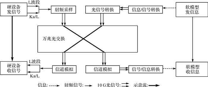 尤其是在系统软硬结合的多层次多状态协同仿真的实现过程中,重点通过统一的软硬环境时间基准,以软件系统和硬件系统分别作为信息和信号生成中枢,实现各类信息信号的仿真与处理。利用万兆交换网络实现信道模拟,实现硬件信号与软件信息的实时传输与转换,实现了软硬件协同配合场景下的全规模整网仿真能力。主要流程如图 6所示。