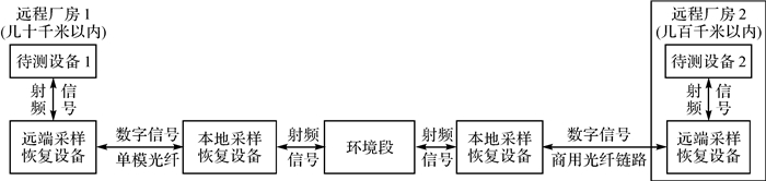 基于光纤链路的射频信号远程传输技术是实现远程互联的核心,主要通过卫星导航双频授时实现高精度时间同步,实现了信号远程低信噪比损失的采样与恢复,保证了射频信号的远距离连续稳定传输[23-24]。将信号采样与恢复设备分别放置于地面试验验证系统机房和远端厂房,数字信号通过光纤远距离交互传输,两地在同步时频下进行射频信号的采样与恢复。通过这种远程对接模式,实现了工程实际系统与地面试验验证系统的虚实结合仿真试验,可大幅提高试验效率、减少人力物力等资源消耗。系统连接关系如图 8所示。