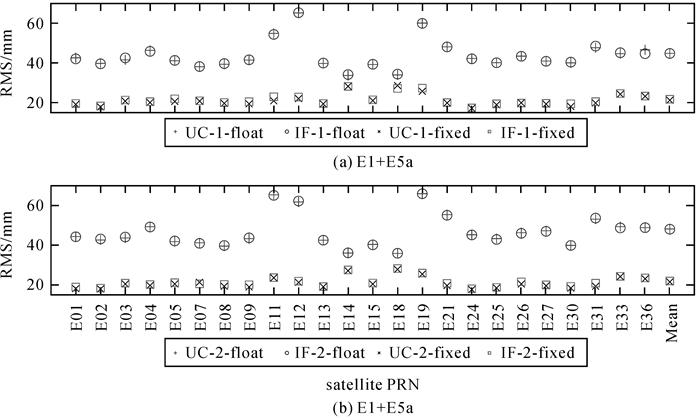 图 2给出了Galileo卫星使用双频观测值时,不同策略下定轨结果与CODE精密轨道产品比较结果的1DRMS平均值。其中UC-1、IF-1、UC-2和IF-2策略浮点解RMS平均值分别为44.6、44.7、48.2 mm和48.1 mm,UC-1与IF-1策略间轨道差异和UC-2与IF-2策略间轨道差异都小于1 mm;固定解RMS平均值分别为21.1、21.6、21.4 mm和22.0 mm,4者差异同样小于1 mm。上述结果表明,在使用相同观测值时,UC策略和IF策略的平均RMS差异在1 mm以内,两者精度相当。