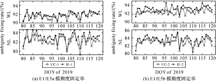 | 图 3 双频UC和IF策略精密定轨模糊度固定率 Fig. 3 Ambiguity fixed rate of dual-frequency UC and IFmodel |