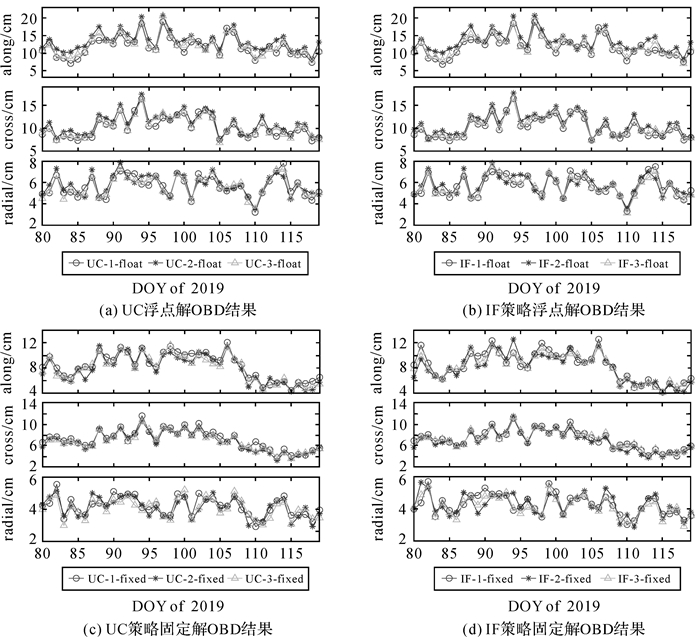 (3) 在观测值类型一致时,本文提出的UC策略和传统的IF策略的浮点解及固定解OBD结果在切向、法向和径向上的差异小于2.5 mm,不同策略间OBD的1D RMS差异不超过2 mm。