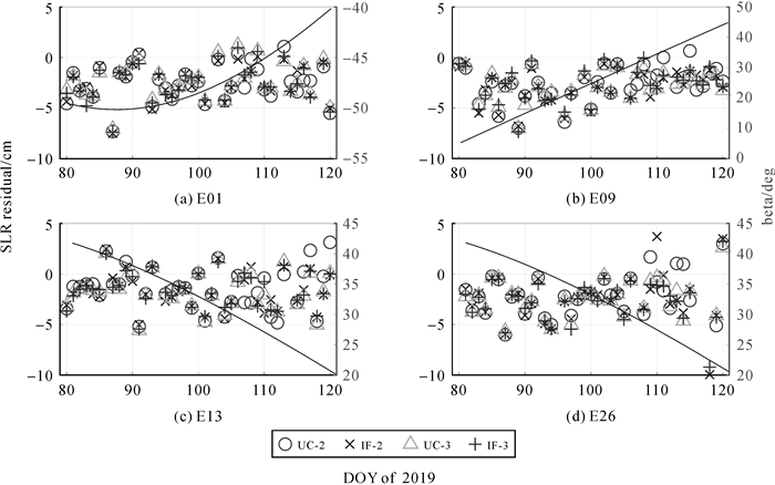 SLR是一种高精度的绝对距离观测值,因其不包含载波相位模糊度,并具有系统误差小、不受钟差和天线相位中心误差影响的优点,可用于对精密卫星轨道进行检核评估。所有Galileo卫星都配备了用于SLR检核的激光反射器阵列,并由国际激光测距服务(international laser ranging service, ILRS)组织的地面观测网络跟踪[35],因此本文还对不同策略定轨结果进行了SLR检核。