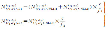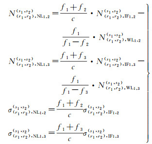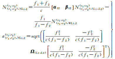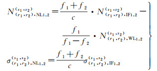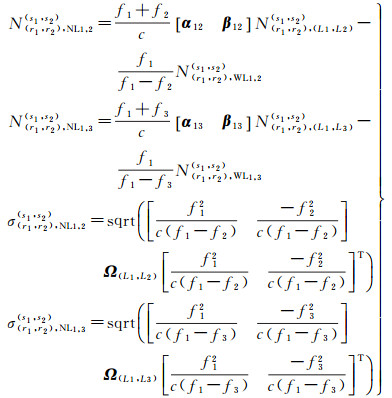 式中,N(r1, r2), (L1, L2)(s1, s2)为f1和f2频率的双差UC模糊度;Ω(L1, L2)为f1和f2频率的双差UC模糊度的协方差阵;α12、β12为f1和f2频率的IF组合系数。最后,对于f1和f2频率,其UC模糊度可以表示为