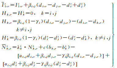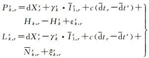 式中,dXrs=αrs(ϕ(t0, t)·X0s-Xr)+Mrs·Tr为非频率相关参数;αi, j=fi2/(fi2-fj2)和βi, j=-fj2/(fi2-fj2)为IF组合系数;Br, i, js=c(αi, jdi, r+βi, jdj, r)+c(αi, jdis+βi, jdjs)为引入的硬件延迟改正数;dtr、dts分别为IF组合接收机钟差和卫星钟差。由于钟差基准中所引入的偏差项和卫星及接收机相关,并且伪距和相位观测值中都存在该参数,因此在最小二乘平差准则中,其值能被电离层参数吸收,此时电离层参数可表示为I1, rs=I1, rs+βi, j(di, r-dj, r-dis+djs)。对于频率k,将以频率i和j的无电离层组合基准代入频率k的观测方程,可以得到式(4)
