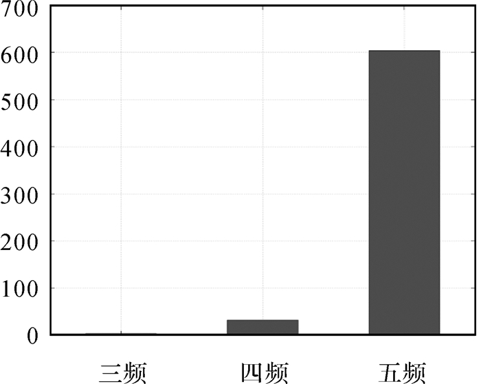 为探索北斗三号TCAR、FCAR及FiCAR理论上的最优组合,需要详细研究各种不同系数组合的虚拟信号性质。根据官方最新发布的文件,北斗三号系统三频数据通常是指B1C、B3I和B2a这3类信号,北斗三号四频数据通常是指B1C、B1I、B3I和B2a这4类信号,北斗三号五频数据通常是指B1C、B1I、B3I、B2b和B2a这5类信号[25-26]。由于需要实现模糊度单历元固定,首先考虑信号波长较长,电离层尺度因子较小和观测值噪声比例系数较小的最优超宽巷组合,本文将同时满足系数范围在常用的[-10, 10],以及λ≥2.93 m、|β(k)|<1.8和|η(k)|<250的信号作为高质量信号。北斗三号三频、四频和五频场景下满足上述条件的高质量信号总数分别为3、32和604,具体数量对比如图 1所示。可以发现,频率数越多高质量信号越多,尤其是当有5个频率时,高质量信号分别为四频和三频的约20倍和200倍,呈现指数式增长。因此,当频率数增加时,MCAR中可供选择的高质量信号越多。