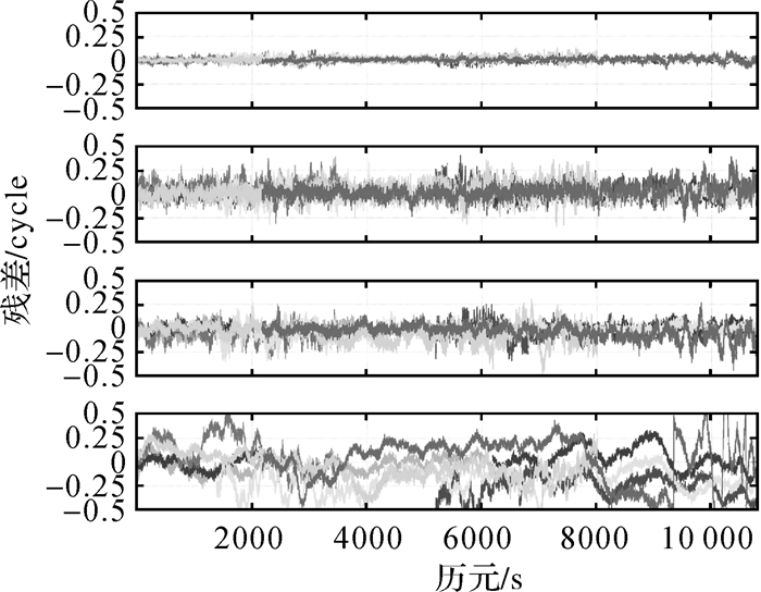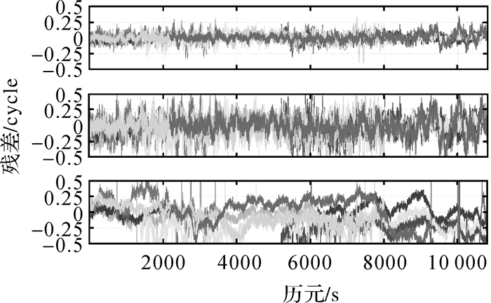 | 注:从上到下依次为∇ΔΦ[0, 1, -1]、∇ΔΦ[1, -2, 1]和∇ΔΦ[0, 0, 1]的结果。 图 2 北斗三号TCAR的模糊度浮点解与真值之间的残差 Fig. 2 The residuals between the float and true solutions of BDS-3 TCAR |