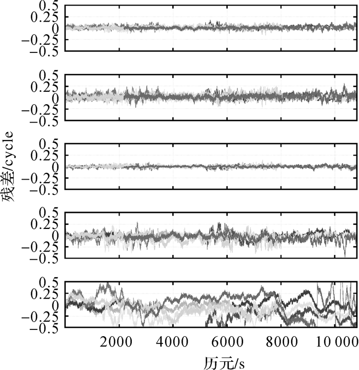 | 注:从上到下依次为∇ΔΦ[0, 0, 0, 1, -1]、∇ΔΦ[0, 0, 1, -1, 0]、∇ΔΦ[1, -1, 0, 0, 0]、∇ΔΦ[0, 1, -2, 0, 1]和∇ΔΦ[0, 0, 0, 0, 1]的结果。 图 4 北斗三号FiCAR的模糊度浮点解与真值之间的残差 Fig. 4 The residuals between the float and true solutions of BDS-3 FiCAR |