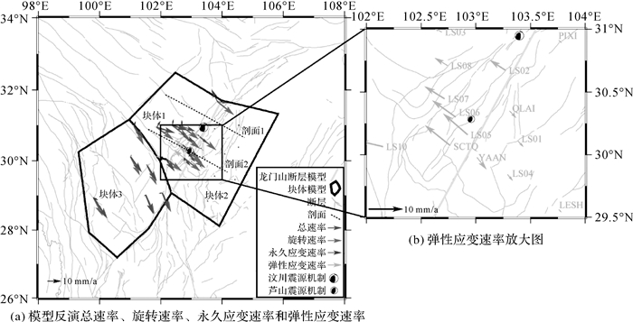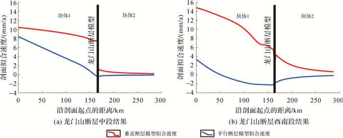 (2) 龙门山断层不同段震后活动特征有显著差异。垂直龙门山断层模型的两条剖面拟合结果表明,龙门山断层中段在汶川地震后仍处于蠕滑状态,断层两侧存在明显的挤压运动差异,且在块体1内部右旋扭动变形明显。龙门山断层西南段在块体1内部挤压变形明显,且在块体2内部也产生了较强的挤压变形;垂直断层模型拟合速度结果基本符合反正切函数的分布特征,表明龙门山断层西南段闭锁很强,积累挤压弹性应变能的速率更快。龙门山断层西南段在近断层处和块体之间表现出不同的走滑运动特征,表明龙门山块体内部变形在靠近龙门山断层处表现出扇形分布特征,在龙门山断层西南端点附近作挤出运动。