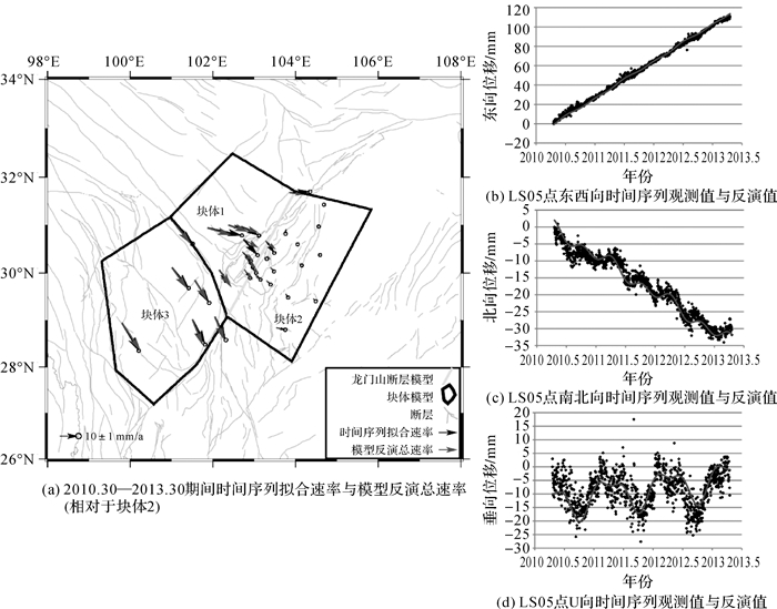 通过将模型反演所得各点的GPS总速率值与由时间序列直接拟合得到的速率值进行对比,即对比模型拟合速率残差,能够在一定程度上检验反演结果拟合的好坏,图 3(a)结果显示速率模型值与时间序列拟合值相符性较好,表明模型拟合效果较好。同时GPS站点3个方向的时间序列观测值与模型反演值能够显示各个站点的具体拟合情况,图 3(b)-图 3(d)给出了LS05站点(距离龙门山断层很近且弹性应变速率很大,具体位置见图 2(b))的拟合结果,图 3(b)为东西(EW)向观测值与反演值、图 3(c)为南北(NS)向观测值与反演值、图 3(d)为U向观测值与反演值,结果显示整体拟合效果较好,表明反演结果可靠。