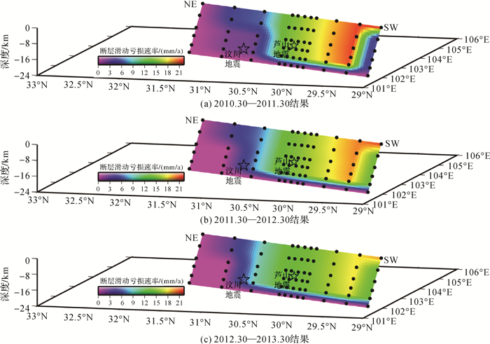 考虑到断层闭锁程度和愈合过程在时间和空间上均可能发生变化,本文利用汶川震后、芦山震前3年时间GPS时间序列分不同时间尺度,研究了龙门山断层中南段的闭锁程度、滑动亏损速率的动态演化特征,这有利于更清楚地认识震后断层愈合动态过程。