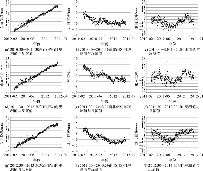 本文利用TDEFNODE负位错反演程序设定模型时,假定断层从地表往下闭锁逐渐减弱、深部蠕滑。由于四川盆地内部变形微弱、整体稳定,因此认为块体2只存在整体旋转运动和由于断层闭锁而产生的弹性应变,内部不存在永久应变。由于龙门山块体和川西北块体内部变形明显,因此认为块体1和块体3存在整体旋转运动、内部永久应变、由于断层闭锁而产生的弹性应变。模型试算过程中,可以调整f值、参数初始值(包括块体运动参数、块体均匀应变参数、断层各个节点的闭锁程度参数)及反演策略(时间序列突跳和年周期及半年周期的扣除、时间序列速率求解方案)等,使反演效果逐渐变优。经过多次试算,得到了2010.30-2013.30期间GPS时间序列最优模型拟合结果,其中GPS时间序列权比因子f取为1.2,拟合所得