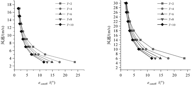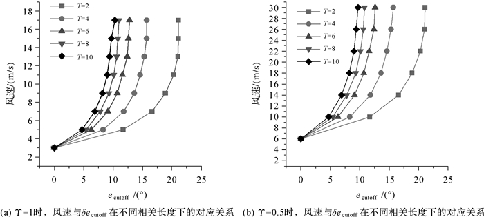 | 图 3 风速与δecutoff在不同相关长度下的对应关系 Fig. 3 Relationship between δecutoff and wind speed with different T |