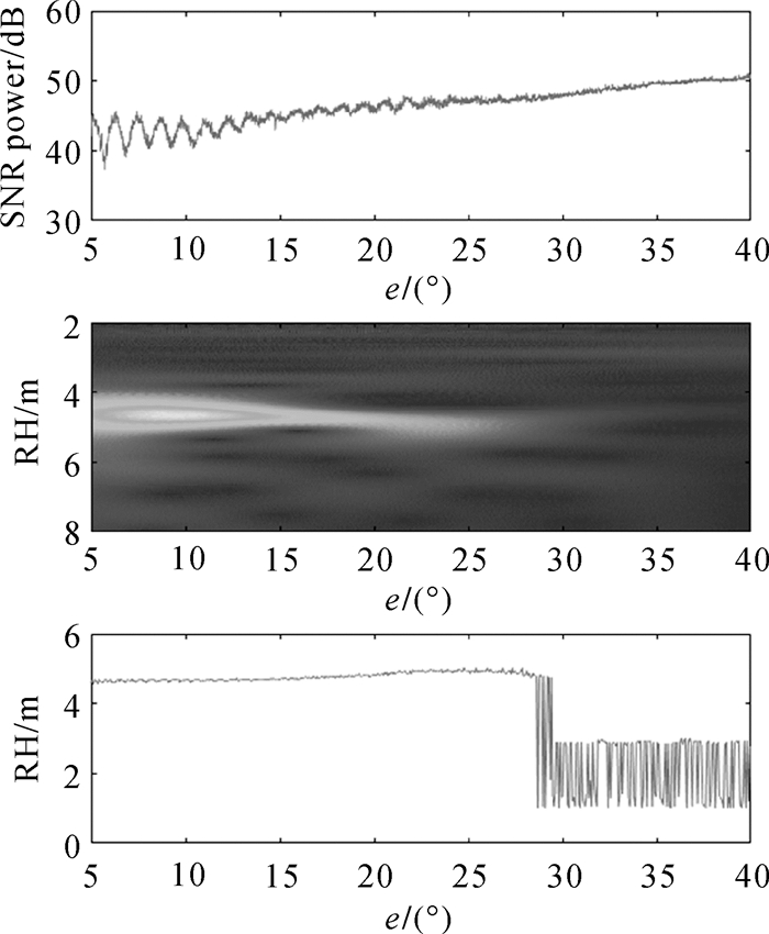 式中,a和b分别是尺度缩放因子和平移因子。要获得小波分析结果,需要计算每个移位参数b的卷积,并对a重复此过程。MATLAB Wavelet Toolbox中的函数--centfrq和scal2frq,给出了a、b参数与频率的映射关系。得到频率后,根据h=(λf)/2(式(1)),将频率转换为RH。图 2给出了HKQT站2018年DOY 258,PRN 1卫星的SNR序列、对应的小波分析谱图及根据谱图能量最大(峰值)选取的RH值,细节详见文献[18-19]。由于SNR噪声总是表现为高频噪声,所以有效RH值和噪声非常容易区分[18-19]。例如,图 2中,当RH大于4时,认为是能反映海面变化的有效RH值,对应的SNR序列振荡明显,相干能量显著;当RH小于4时,认为是噪声信息,对应的SNR序列无明显振荡,非相干能量显著。即RH小于4的起始高度角,可以判定为多径振荡消失的截止高度角。文献[11]中,判定截止高度角的方法是基于最小二乘曲线拟合和特定阈值的;该方法对数据质量要求高且阈值需要根据经验确定,不同站点的阈值可能并不相同,方法较为复杂。而本文的小波分析判定方法,简单易行且不需要基于经验参数。