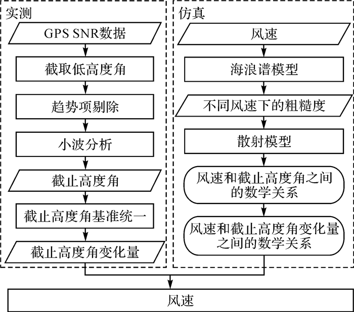 利用反射信号进行风速探测在星载GNSS-R中已经实现,并有相关测风卫星播发[15]。星载GNSS-R测风的思路为:不同的风速会导致不同的海面粗糙度,进而导致反射信号的不同。依据反射信号的特征,就可以反推风速。这样的思路对于地基GNSS-IR同样适用,即利用反射信号特征推演粗糙度及风场信息。目前,关于GNSS-IR海面粗糙度反演及海面风场反演的研究较少。文献[16]利用信噪比(signal-to-noise ratio, SNR)的衰减参数对海面有效波高进行反演。文献[17]利用信噪比的多径截止高度角参数,提出了一种GNSS-IR风向反演方法。然而,该方法对于站点要求较高,需要站点四面环海,接收到全方位角海域反射信号,才能够确定风向。相关研究表明:SNR衰减因子及多径截止高度角可以反映海面粗糙度及风场信息,而且多径截止高度角参数更为准确[16-17]。
