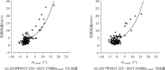 | 图 8 HKQT站δecutoff与风速 Fig. 8 δecutoff VS. measured wind speed at HKQT station |