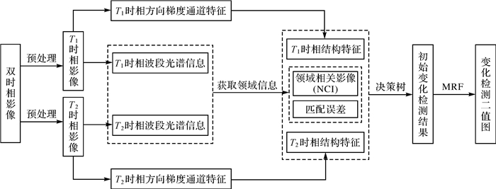 1 本文方法本文方法主要包括以下3个部分:①获取邻域信息:通过提取双时相影像间的NCI特征,获得局部邻域的上下文信息,同时在影像间利用邻域像素的互相关性进行模板匹配获得匹配误差。②结构特征提取:利用方向梯度信息构建结构特征描述符,提取双时相影像的结构特征。③生成检测结果:将NCI、匹配误差、双时相影像结构特征作为属性信息进行决策树分类,获得初始变化检测结果,然后以双时相影像波段差异图为特征场,初始变化检测结果为标记场进行MRF优化,获得变化检测二值图。方法的总体流程如图 1所示。