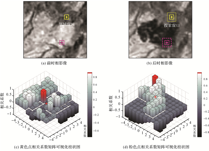 为获得匹配误差,将前时相影像作为基准影像,在后时相影像上对应像元位置开辟一个9×9大小的搜索窗口,然后在搜索窗口内进行模板滑动,计算模板与前时相邻域的相关系数,获得相关系数矩阵,最后通过计算相关系数最大的点到矩阵中心的欧氏距离d得到匹配误差(匹配误差=d)。图 2以黄色点(黄色十字标识符标识的点)和粉色点(粉色十字标识符标识的点)为例对未变化点和变化点的匹配误差进行可视化展示。其中,图 2(a)和图 2(b)分别展示了两点在前、后时相影像中的位置,图 2(c)、图 2(d)分别为黄色点和粉色点的相关系数矩阵可视化柱状图,其中采用红色十字标识符标识相关系数矩阵中心位置,红色柱子标识相关系数最大的点所在的位置。由图 2可以看出,黄色点为未变化点,矩阵中心的相关系数较小,难以给出正确的变化信息,但该点的匹配误差较小(匹配误差为1),可以给出正确的变化信息。粉色点为变化点,矩阵中心的相关系数较大,难以给出正确的变化信息,但该点的匹配误差较大(匹配误差约为5.66),可以给出正确的变化信息。以上初步说明了,相关系数的大小难以精确地反映影像的变化信息,将匹配误差引入到变化检测中,可作为NCI的有效补充。